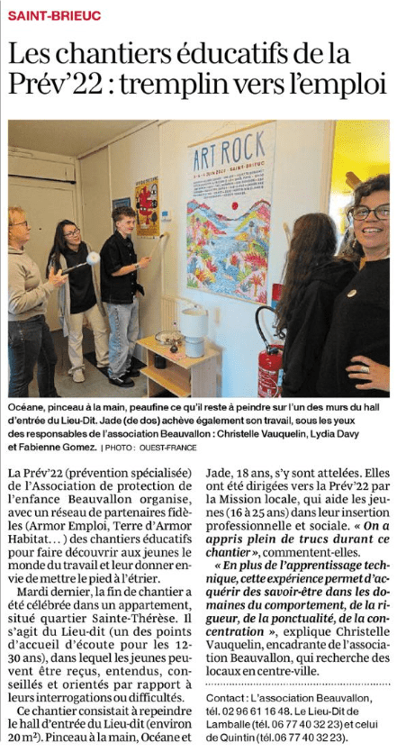 « Les chantiers éducatifs de la Prév’22 : tremplin vers l’emploi » – Article Ouest-France du 13/03/2026Publié le 17 mars 2026 | Navigation d’article ← Article précédent